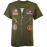 Unlike a traditional Halloween costume, this Top Gun Flight Suit Costume Tee can be worn any day of the year! The military green tee features a design based on Lieutenant Pete "Maverick" Mitchell's (Tom Cruise) flight suit... but on a regular t-shirt. Standard men's sizes. 100% cotton. Officially licensed.